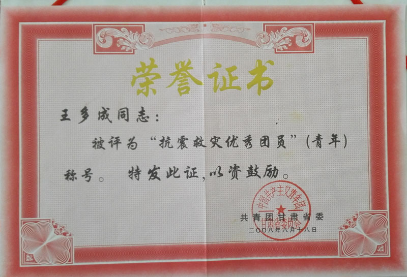 2008年榮獲抗震救災(zāi)優(yōu)秀青年稱號榮譽(yù)證書