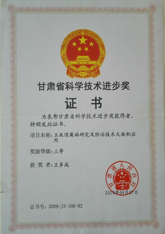 2010年榮獲甘肅省科學技術進步三等獎證書