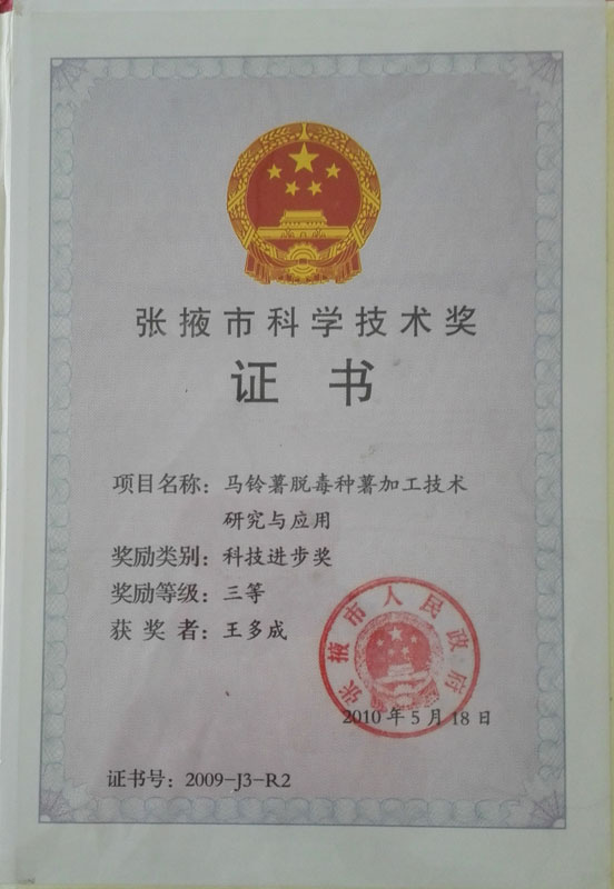 | 2010年榮獲張掖市科技進(jìn)步三等獎(jiǎng)證書(shū) | ||